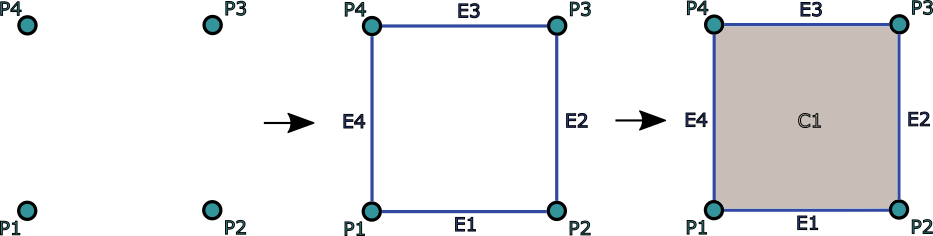 9.2) We define 4 lines by defining nodes that compose each line (see figure Grid consisting of one 2D object which is composed by 4 points / 4 edges / 1 2D cell.):